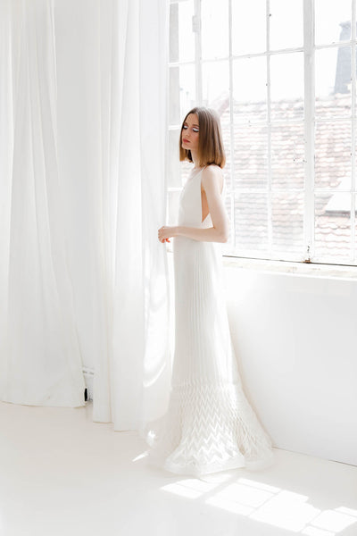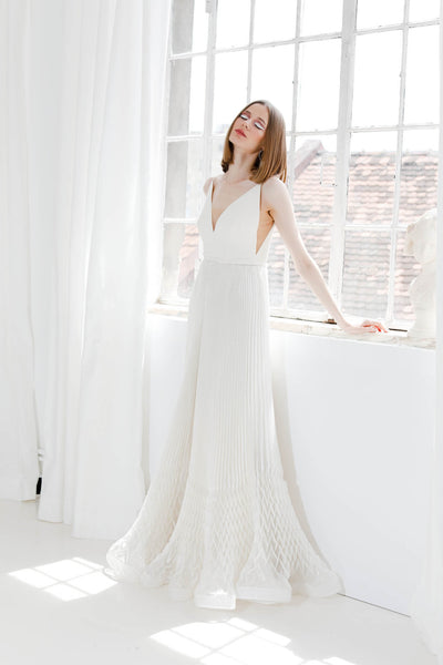 Rochie realizată pe comandă în atelierul Natalia Vasiliev. Pentru programarea unei probe, folosește butonul „Programează o probă”.