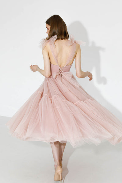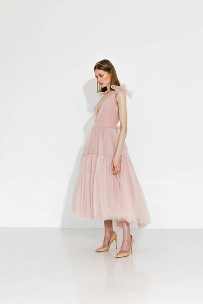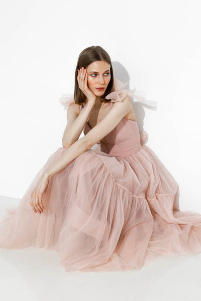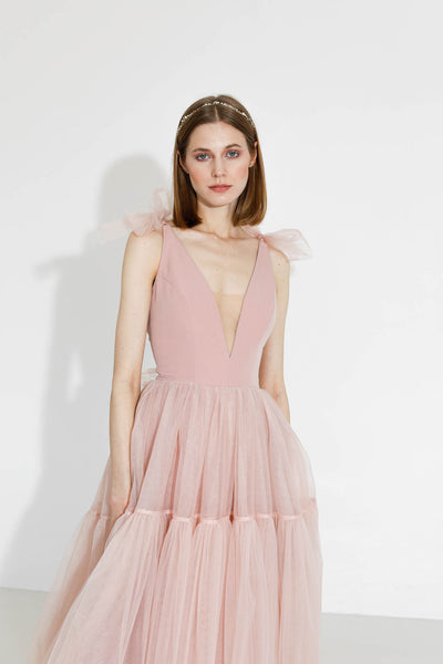 Rochie realizată pe comandă în atelierul Natalia Vasiliev. Pentru programarea unei probe, folosește butonul „Programează o probă”.