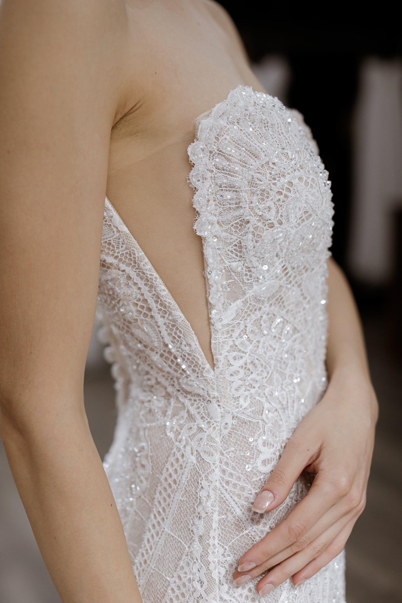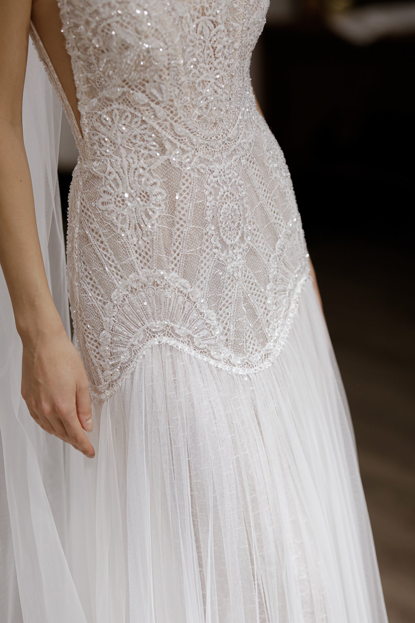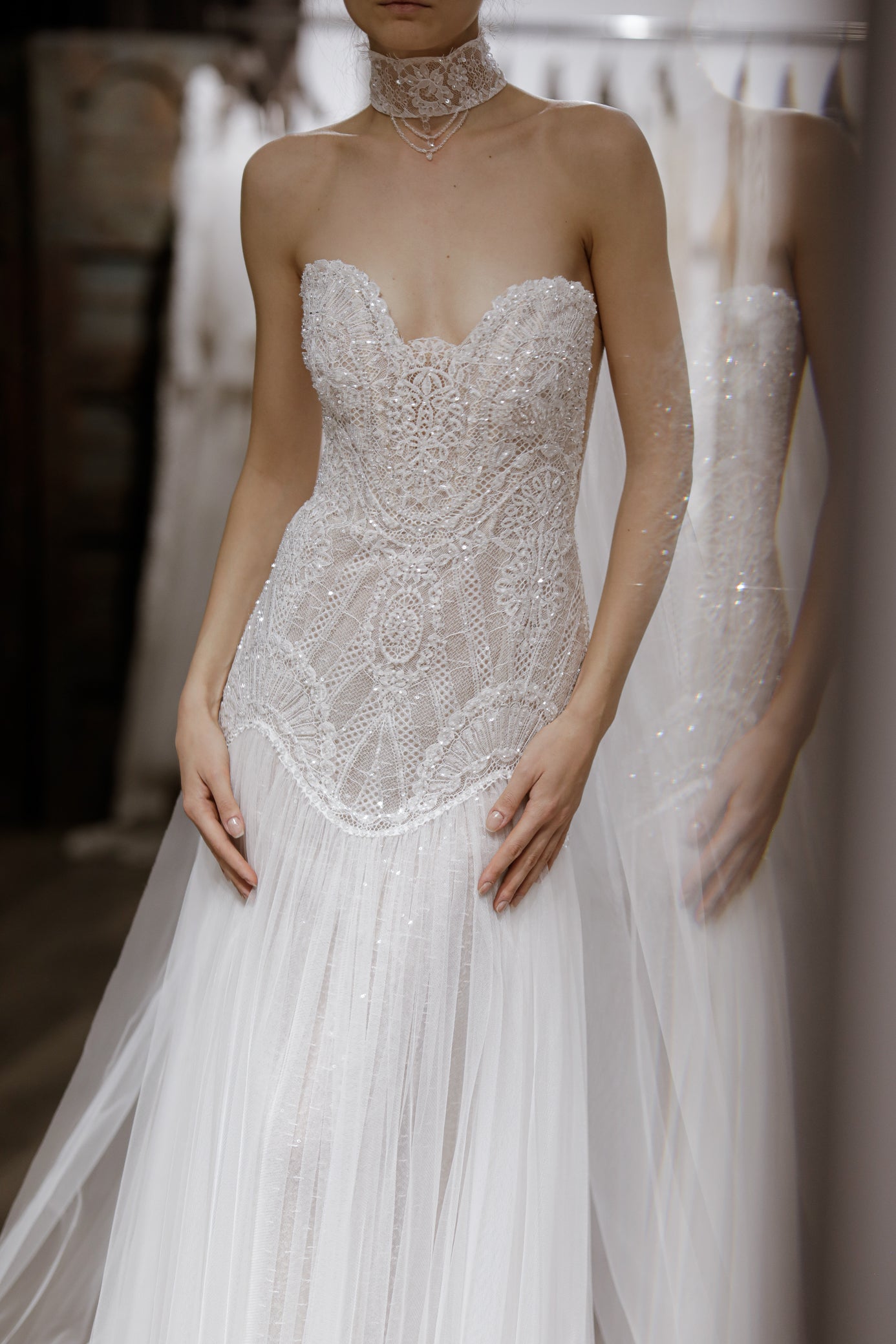 Choker-ul din dantelā brodatā, piesa statement a designului, adăugā o notă couture puternicā si echilibrează perfect minimalismul senzual al bustierei cu detaliile prețioase ale broderiei. Trena ușoară din tulle contribuie la fluiditate, transformand fiecare pas într-o mișcare gratioasā si memorabilā.
