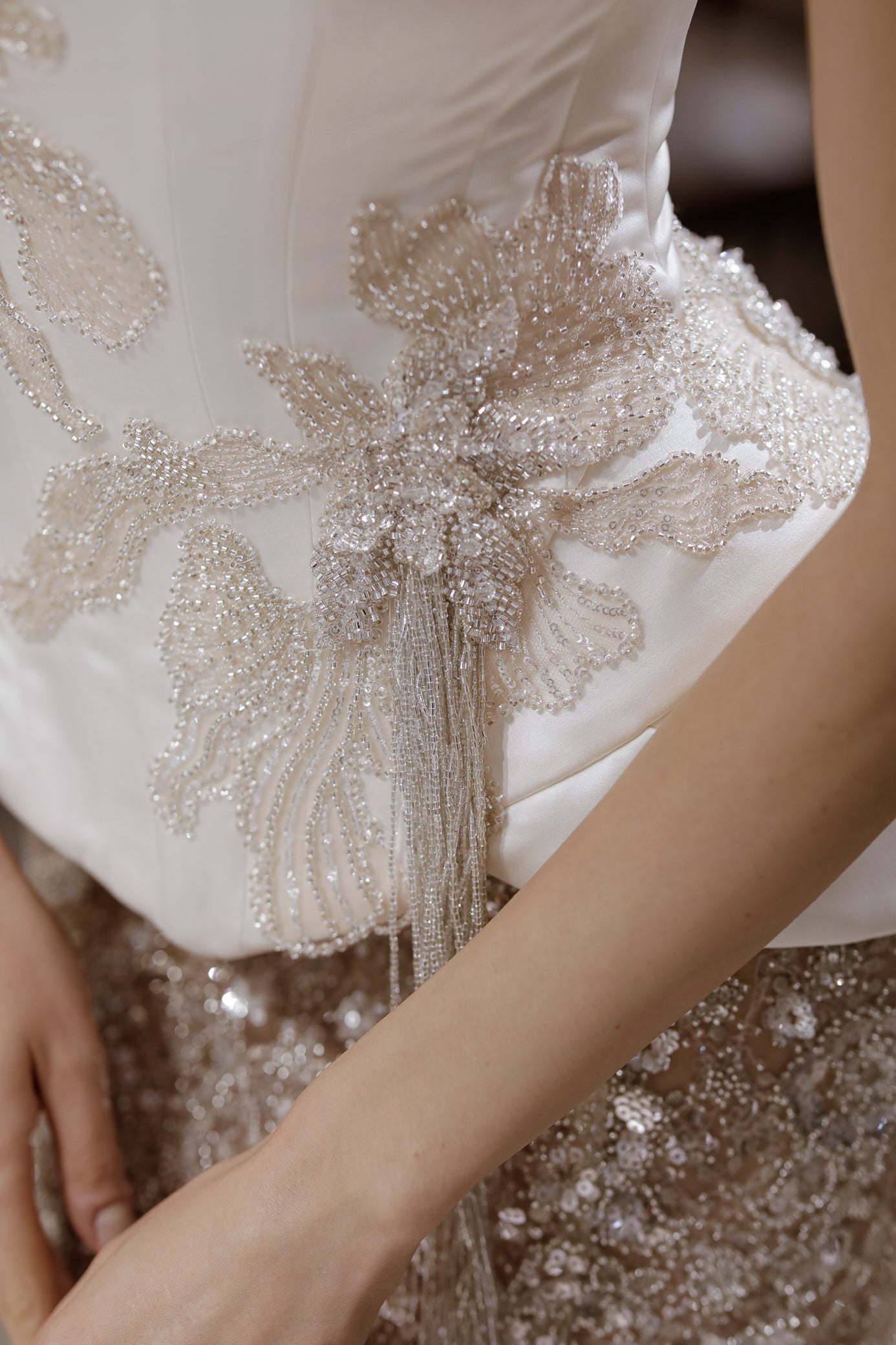 Aceastā rochie de mireasā couture este o declarație de rafinament si senzualitate, creatā pentru mireasa care isi doreste o aparitie memorabilā. Corsetul fără bretele, realizat din satin duchesse in nuanta ivoire, sculptează perfect silueta si este decorat cu aplicatii pretioase, brodate manual, ce se revarsā fluid peste linia taliei.
