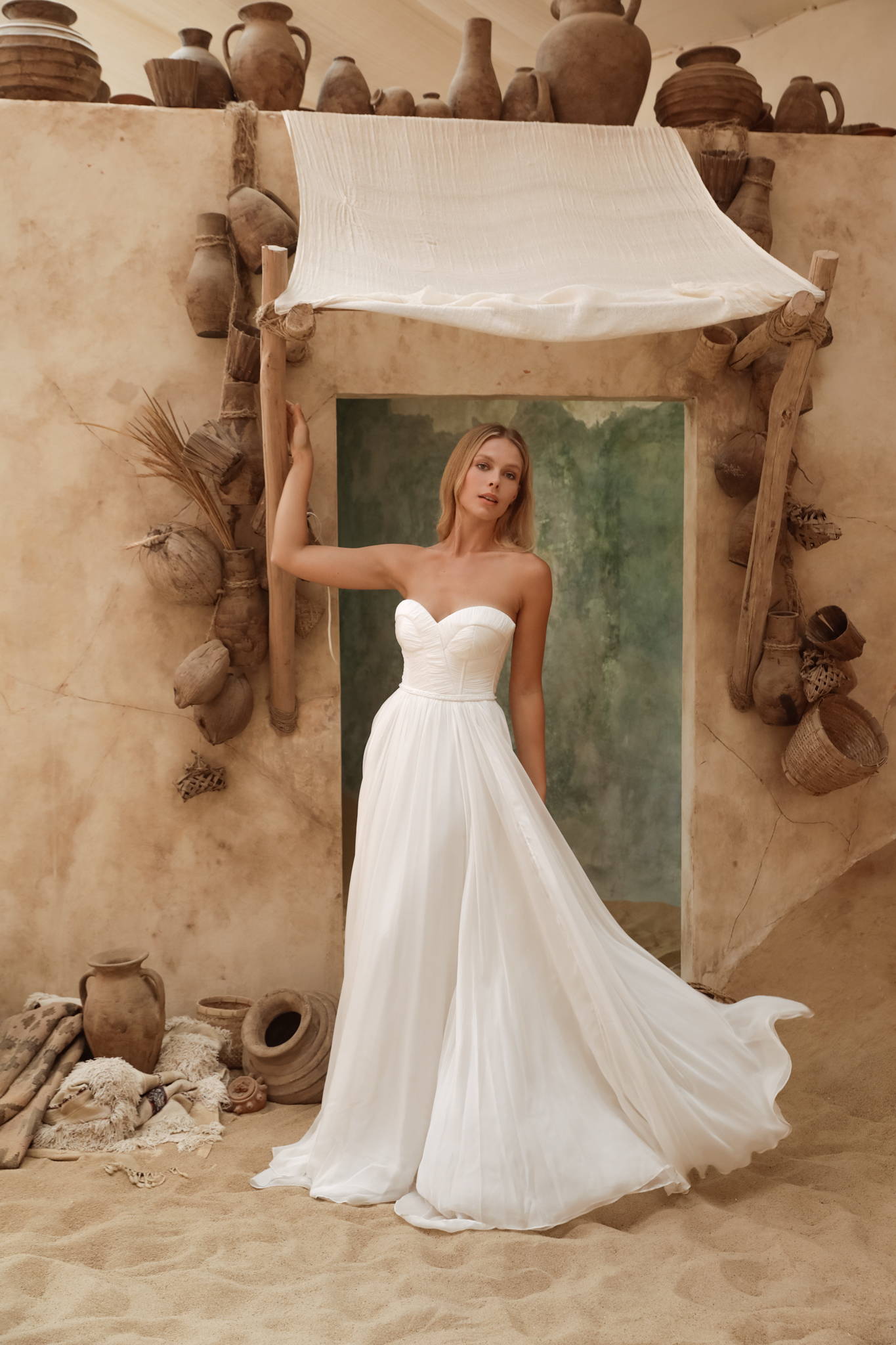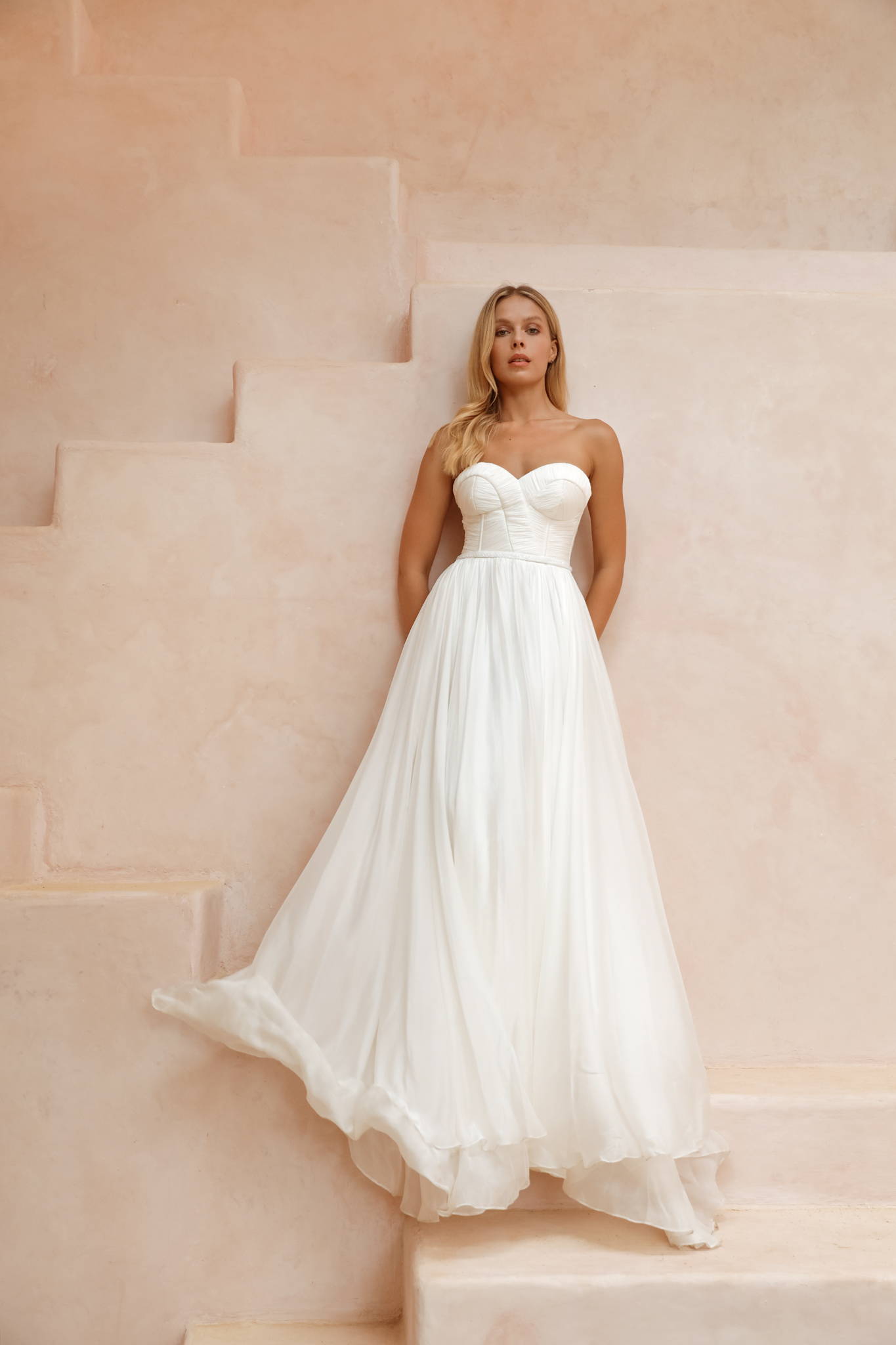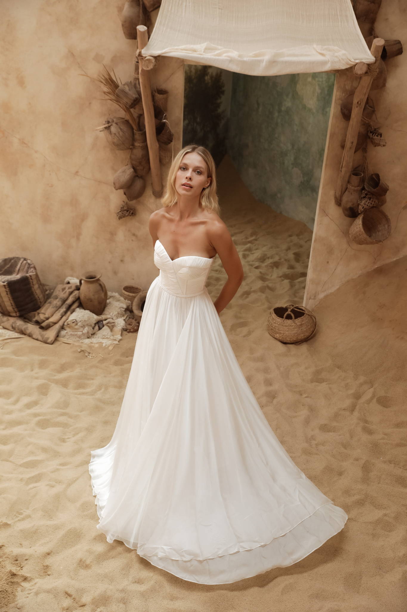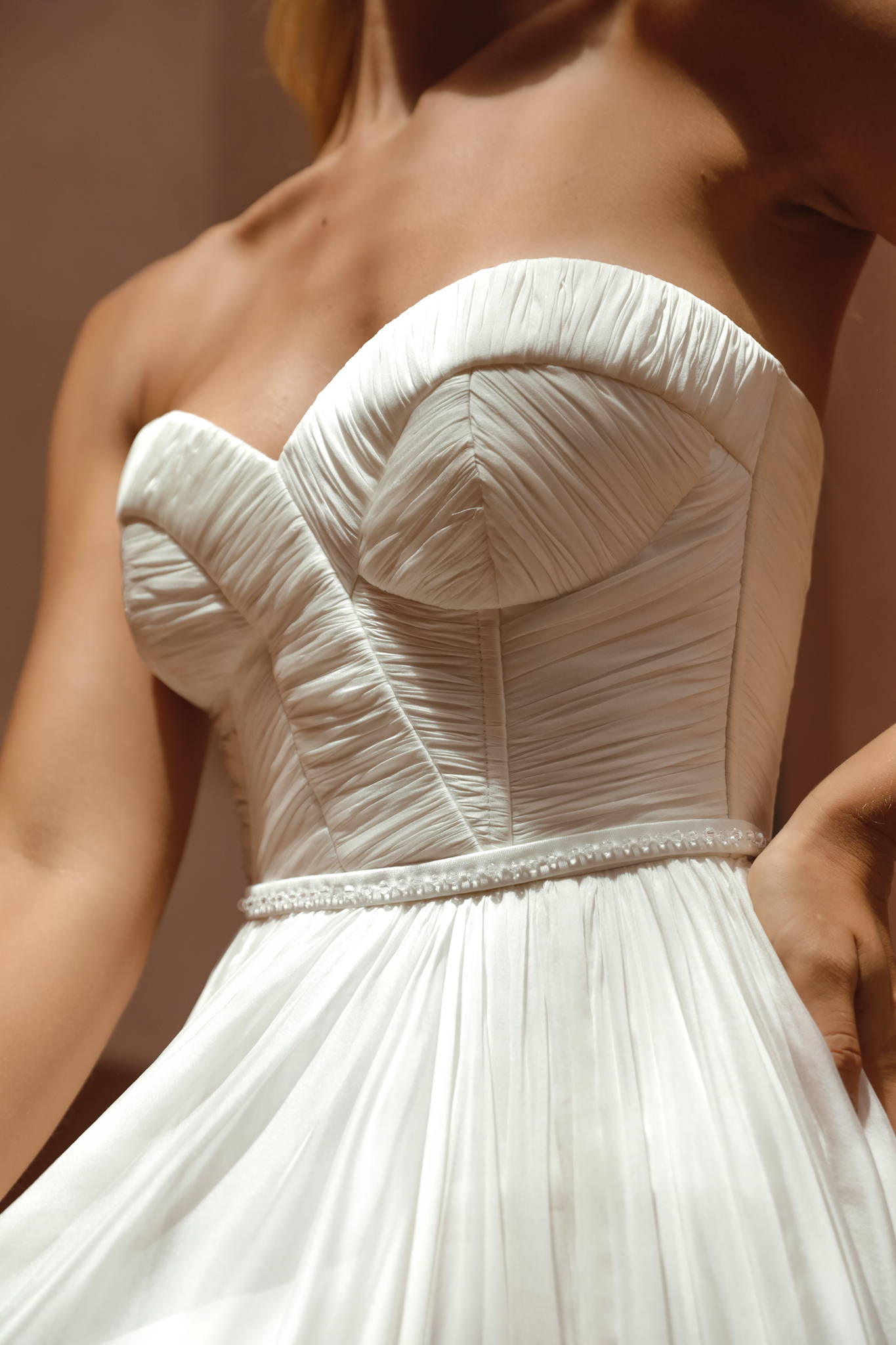 Corsetul pe format balconette prelucrat din drapaj manual aduce un plus de senzualitate in completare fustei voalată in linie A.