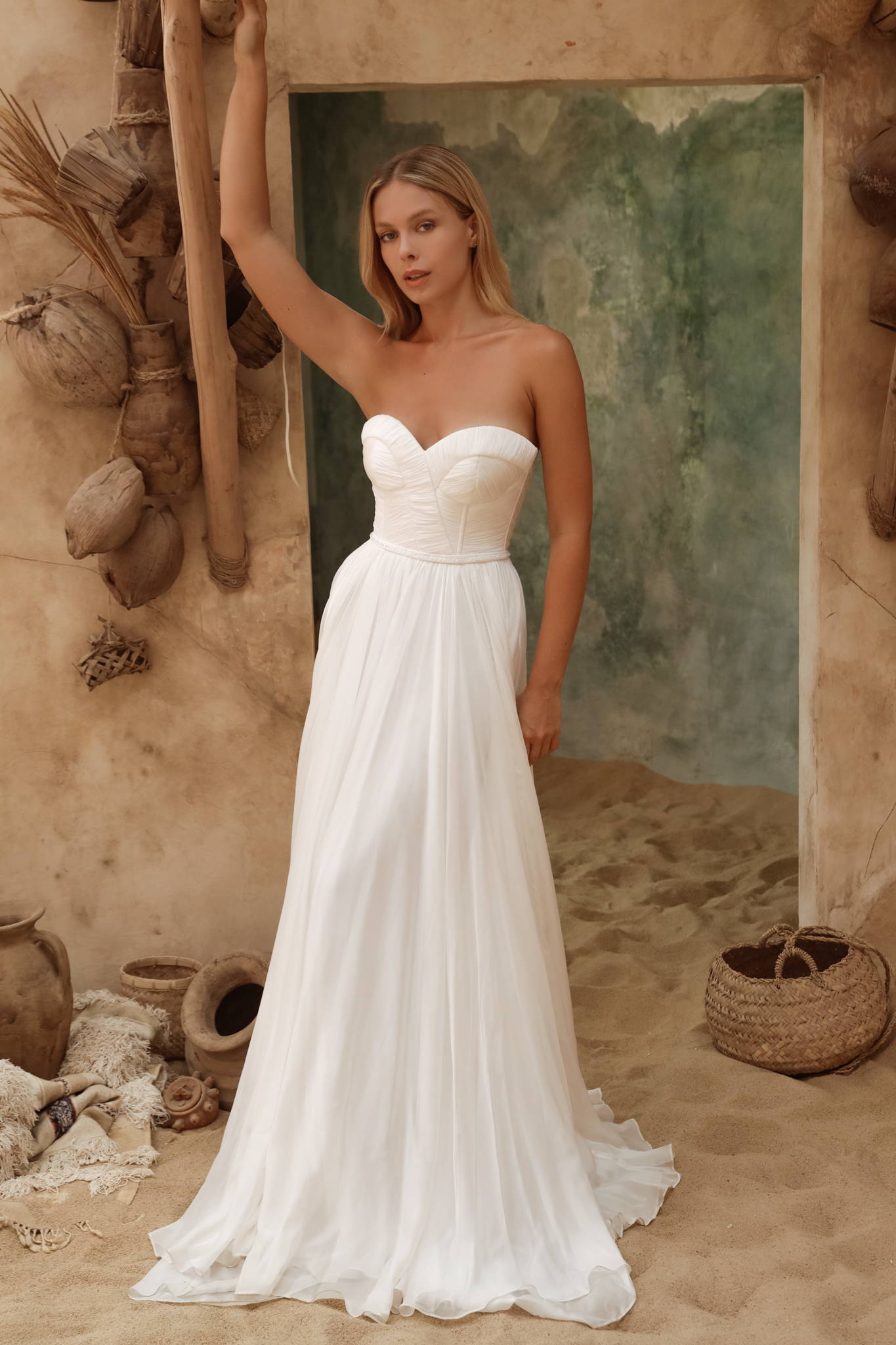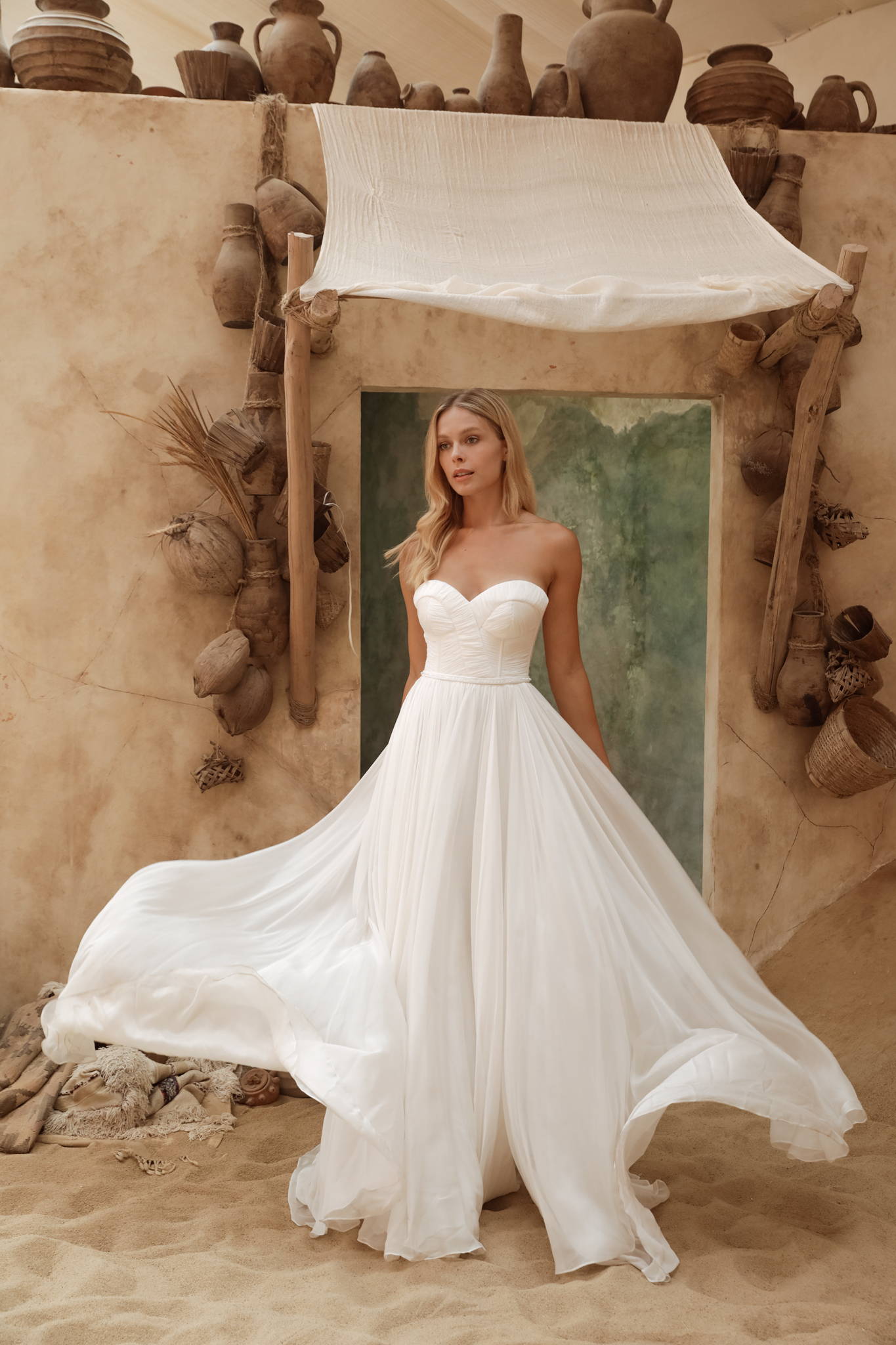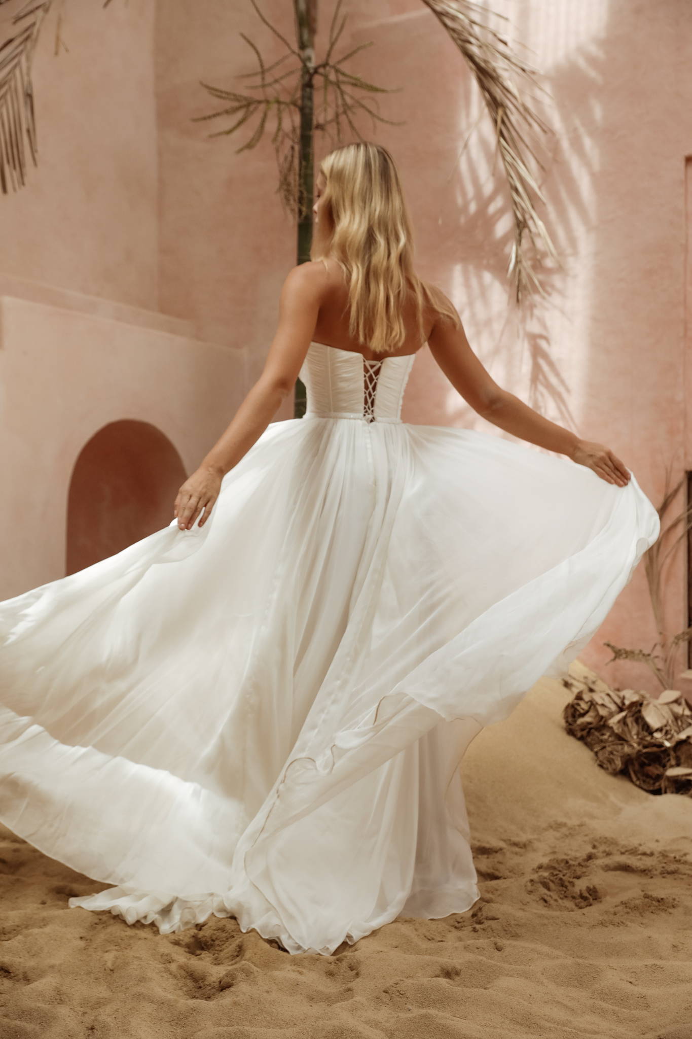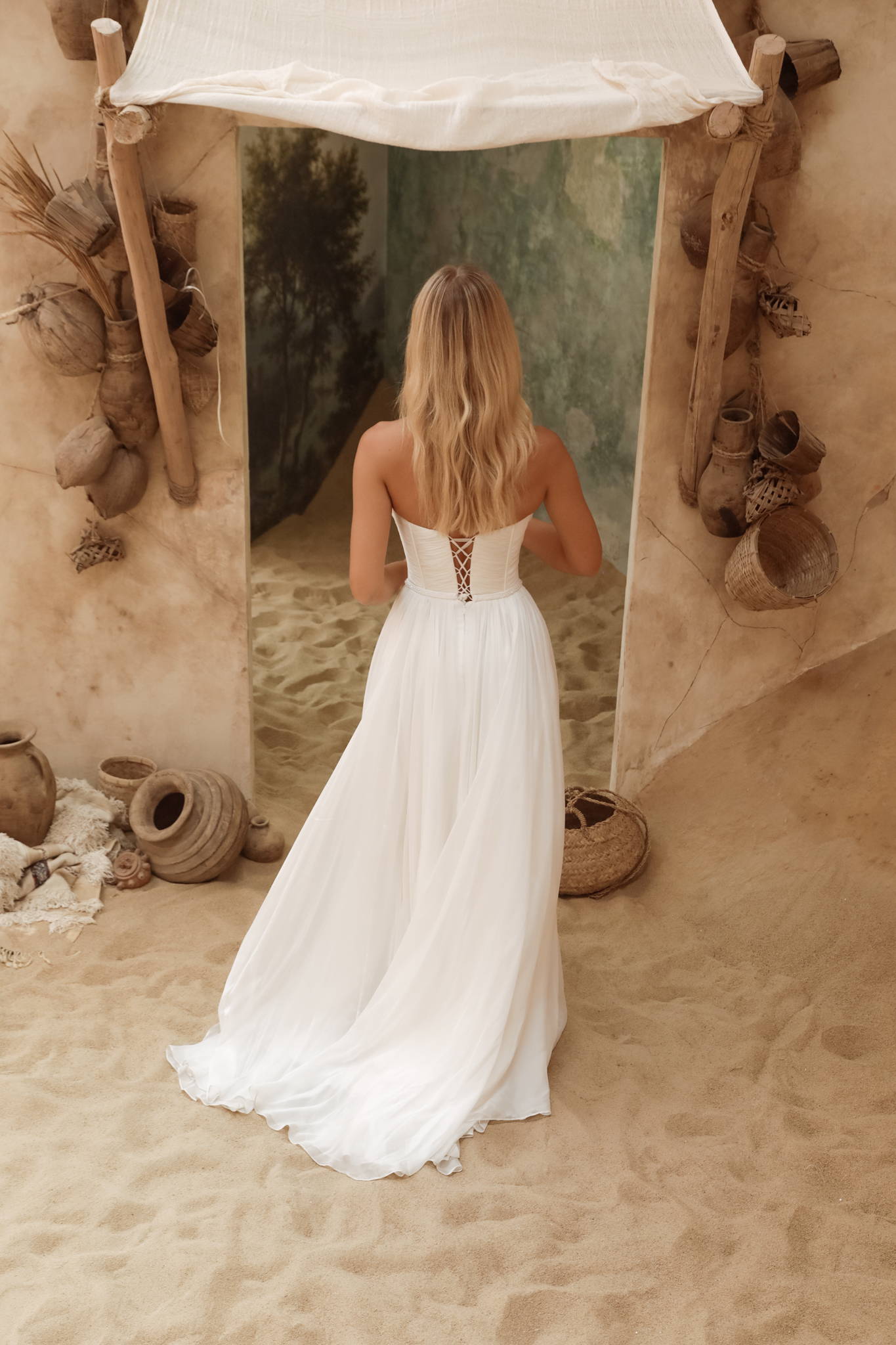 Corsetul pe format balconette prelucrat din drapaj manual aduce un plus de senzualitate in completare fustei voalată in linie A.