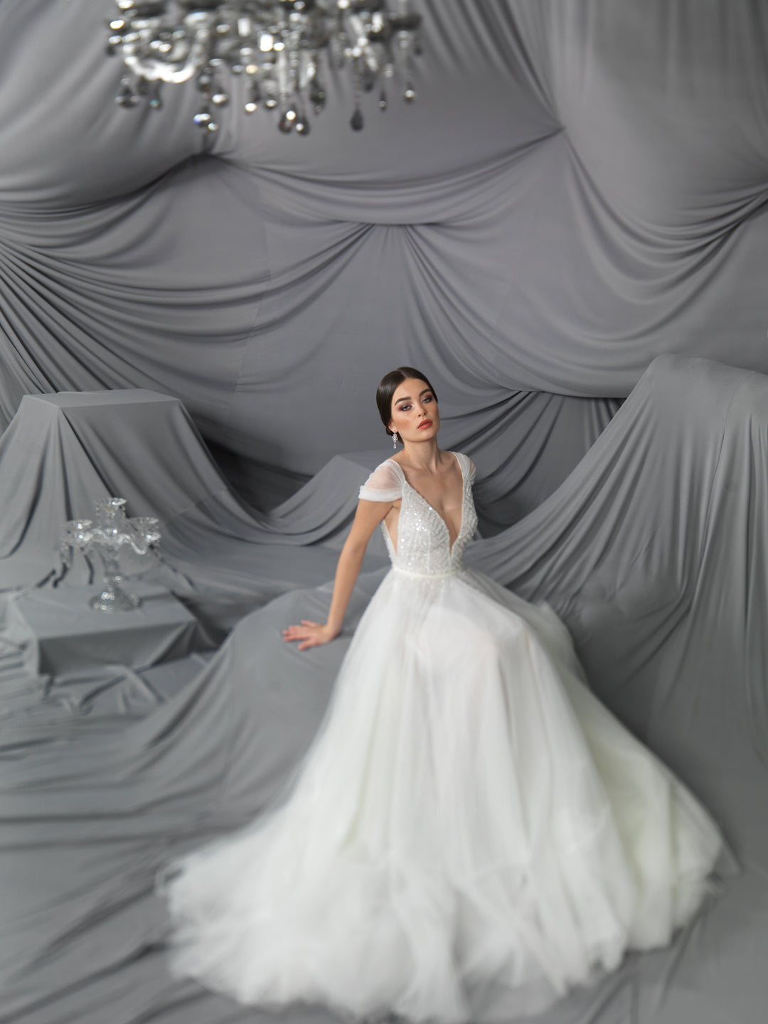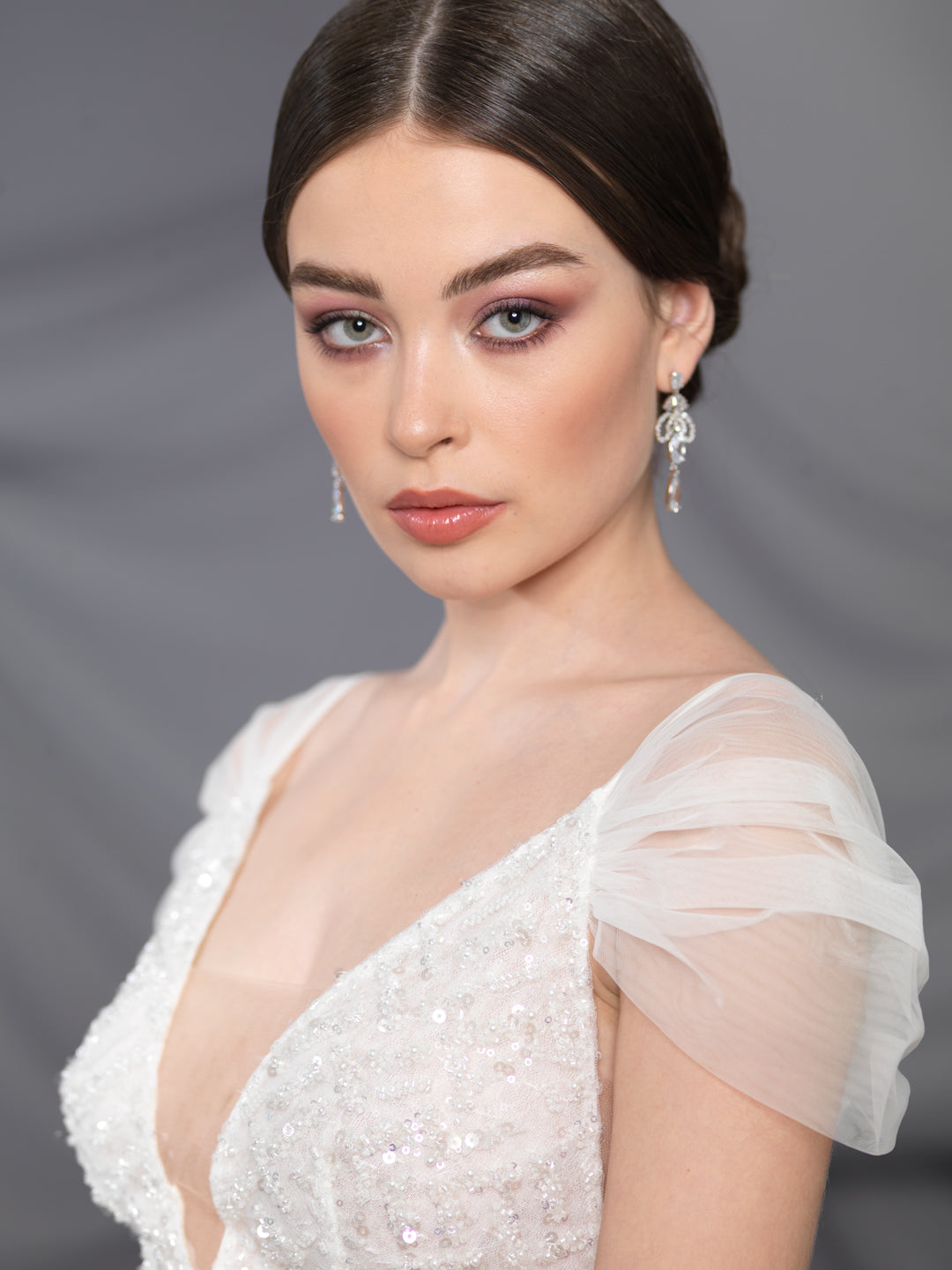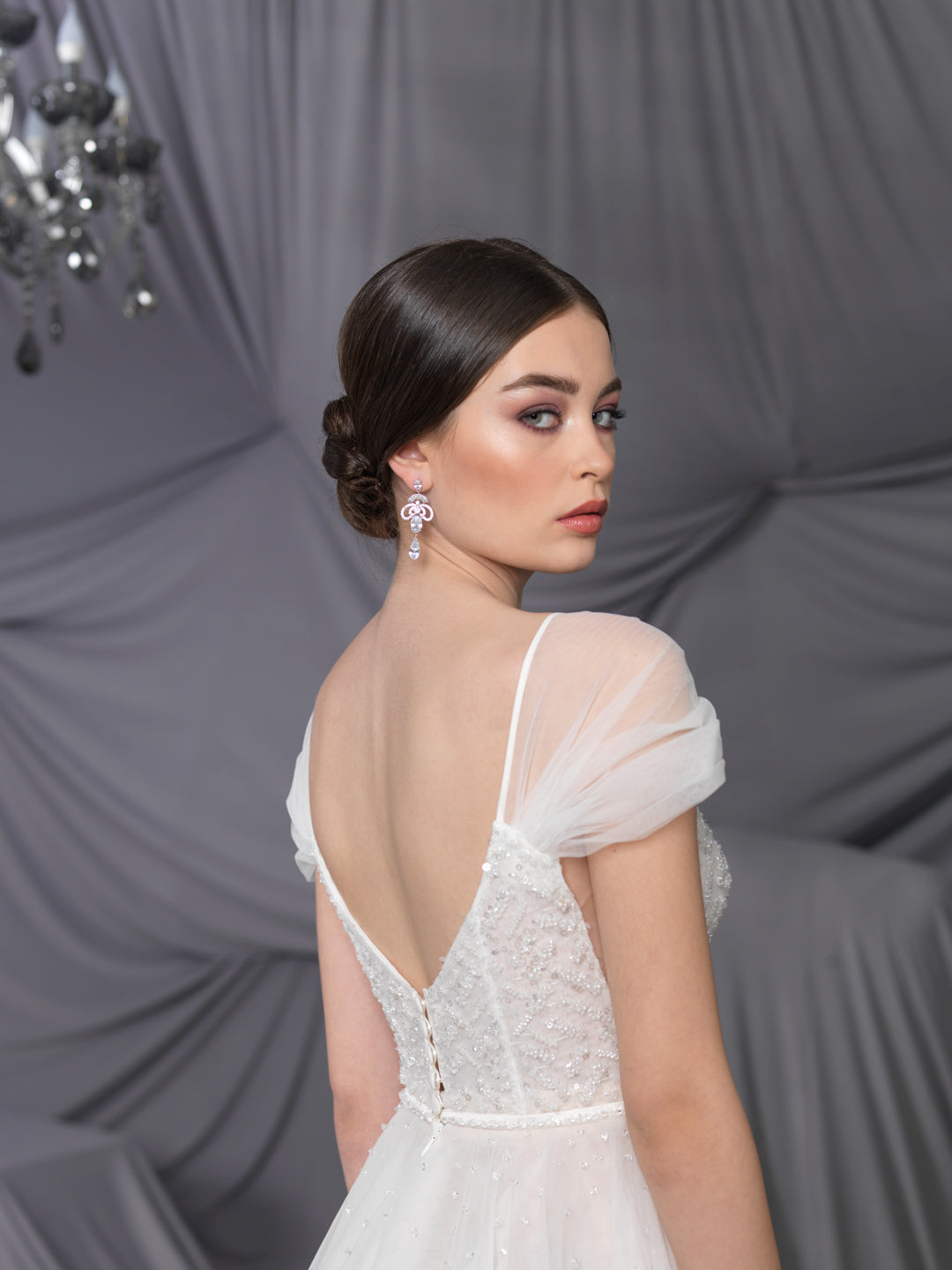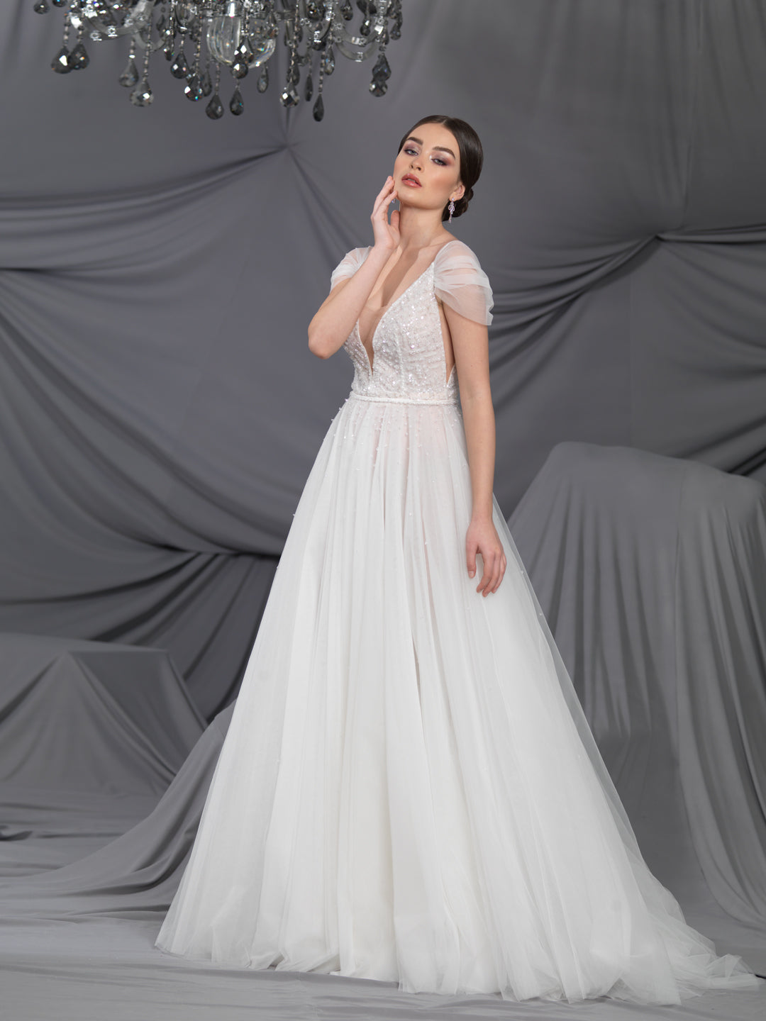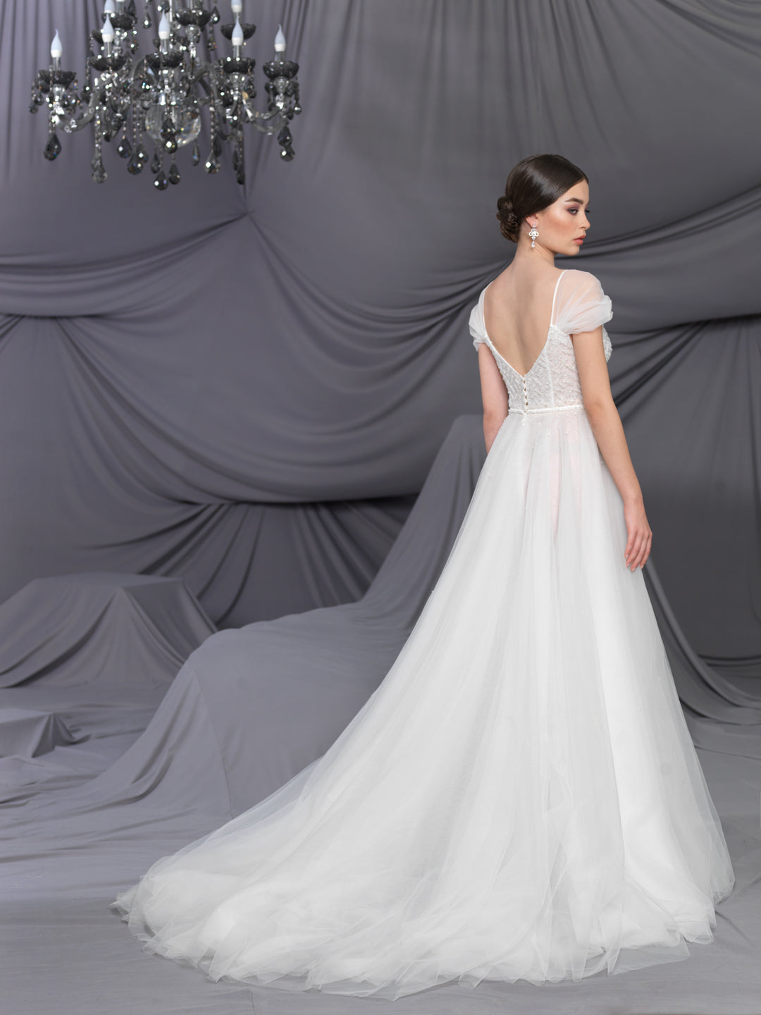Rochie de mireasă custom made, realizată pe comandă în atelierul Natalia Vasiliev. Pentru programarea unei probe, folosește butonul „Programează o probă”.