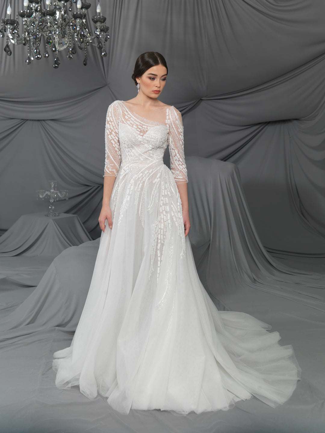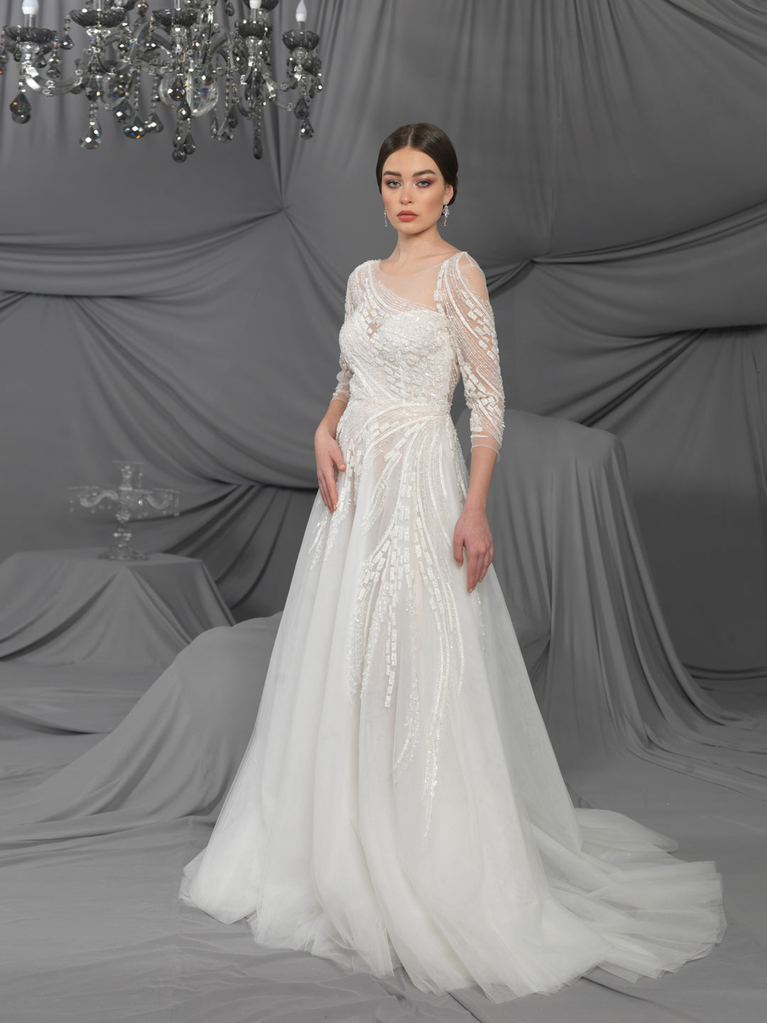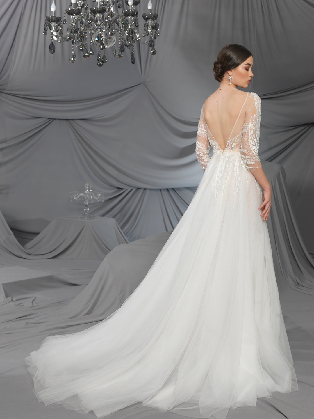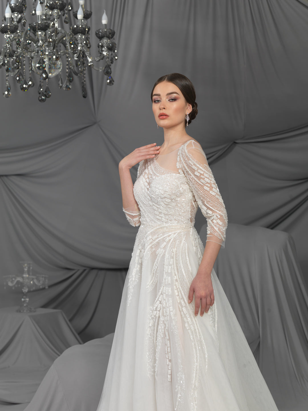Rochie de mireasă custom made, realizată pe comandă în atelierul Natalia Vasiliev. Pentru programarea unei probe, folosește butonul „Programează o probă”.