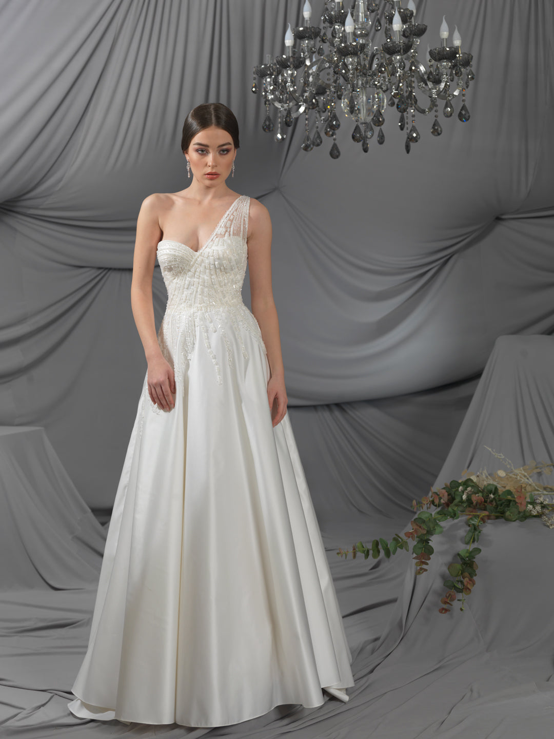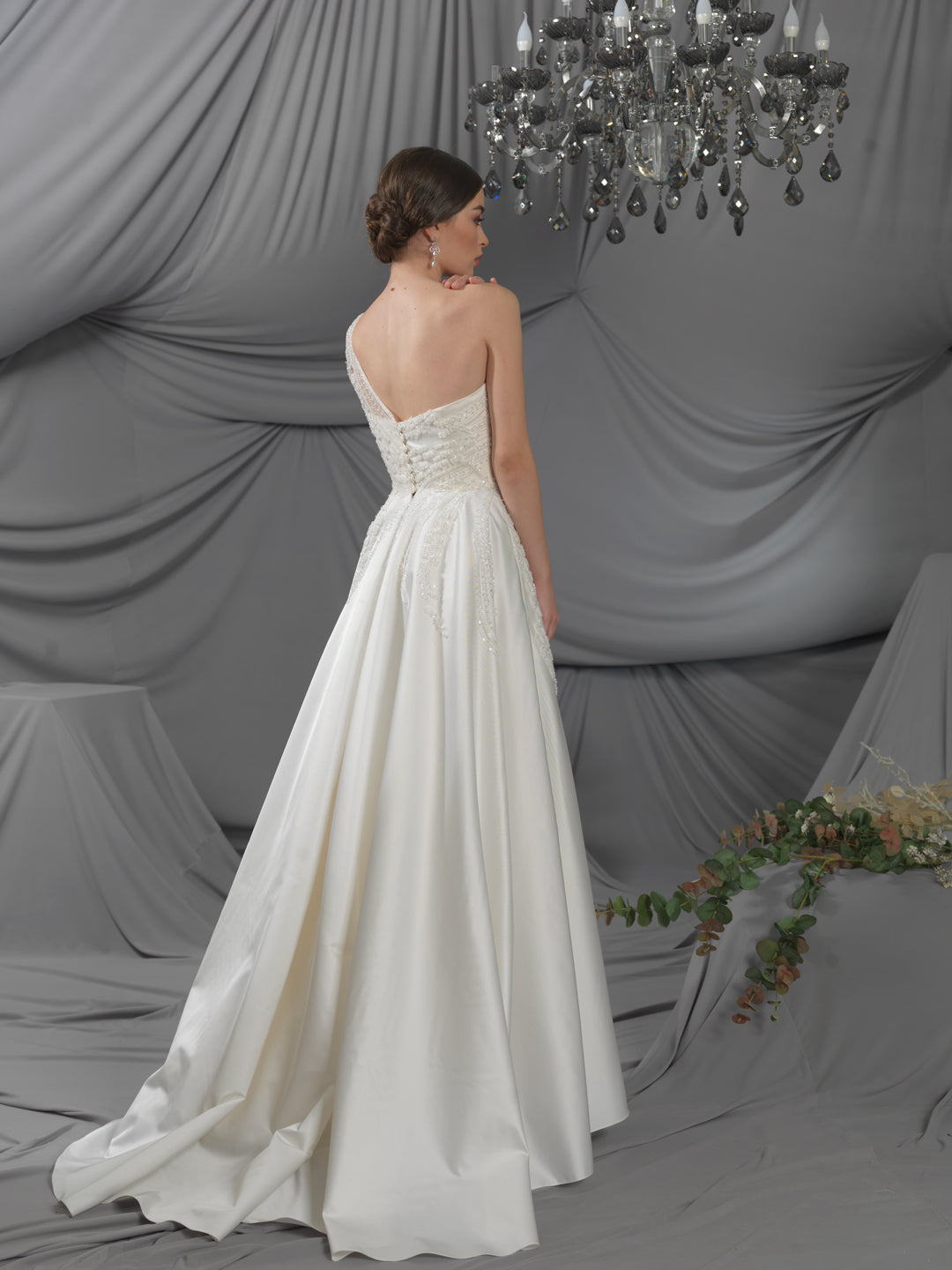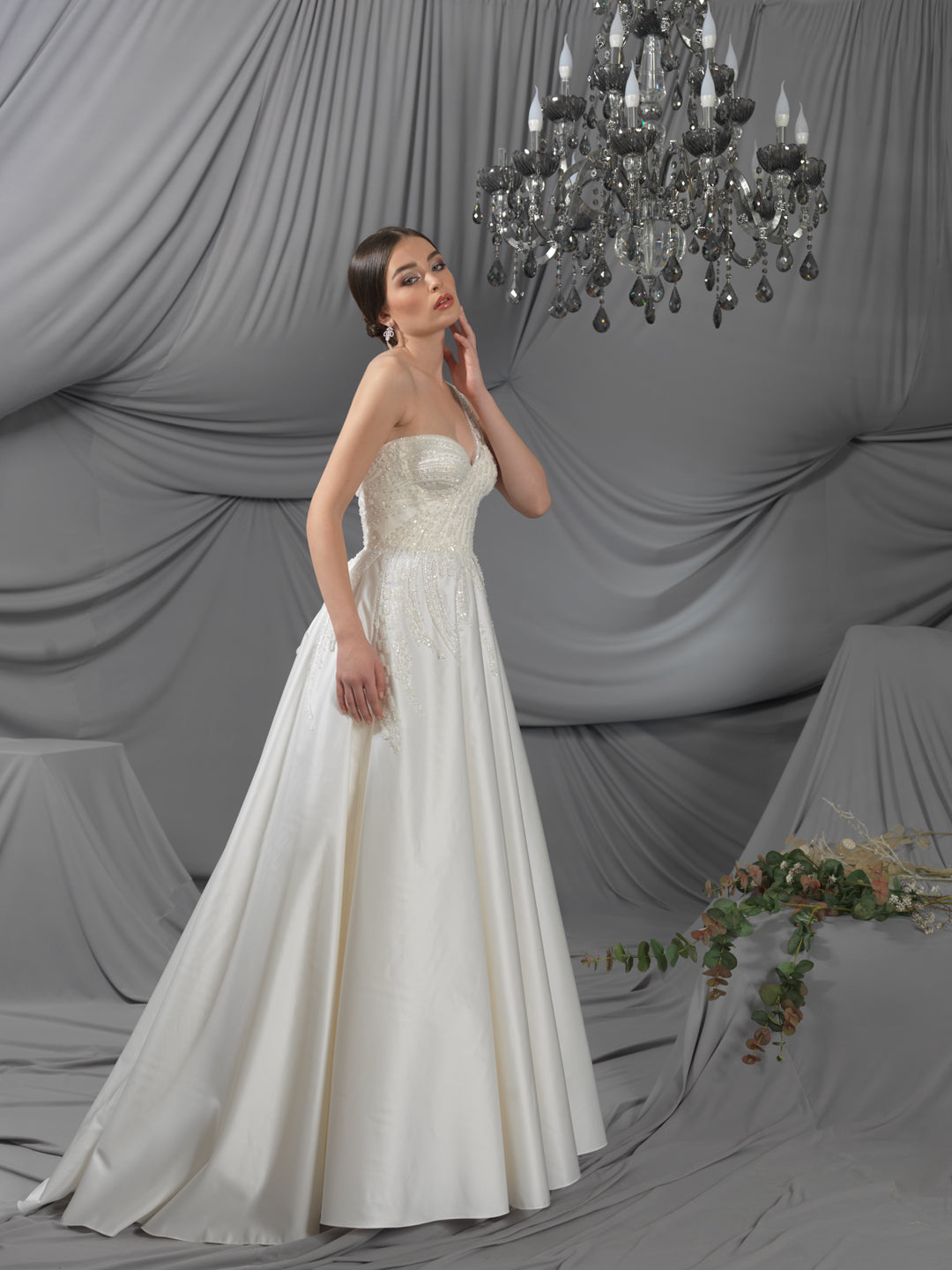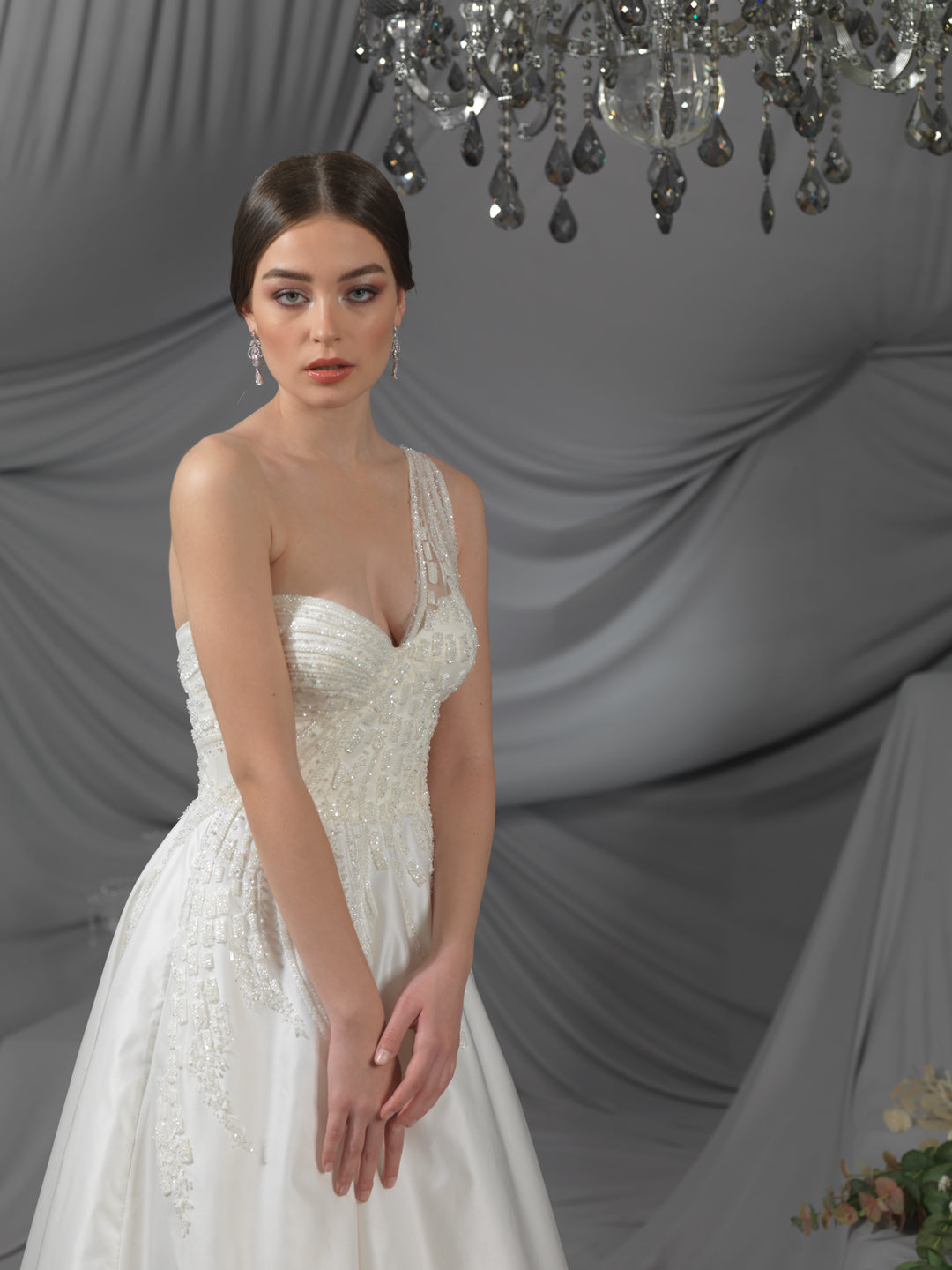 Rochie de mireasă custom made, realizată pe comandă în atelierul Natalia Vasiliev. Pentru programarea unei probe, folosește butonul „Programează o probă”.