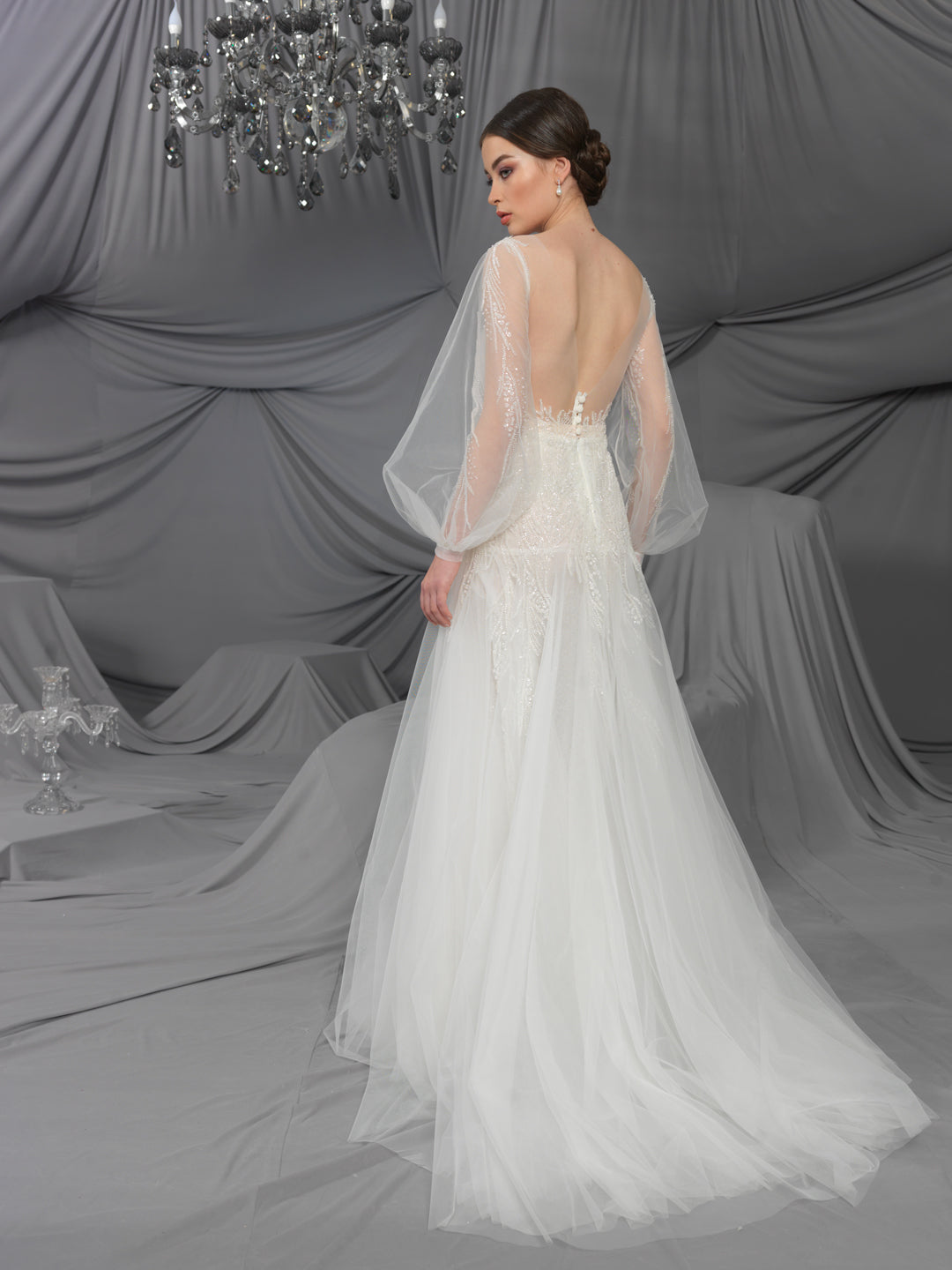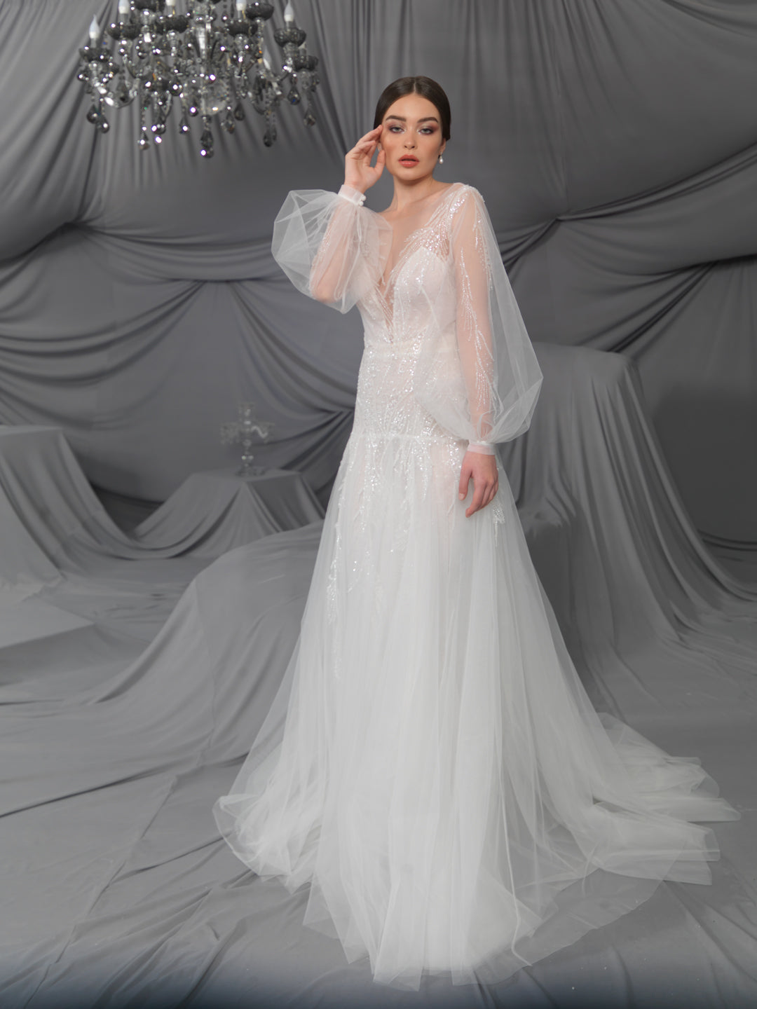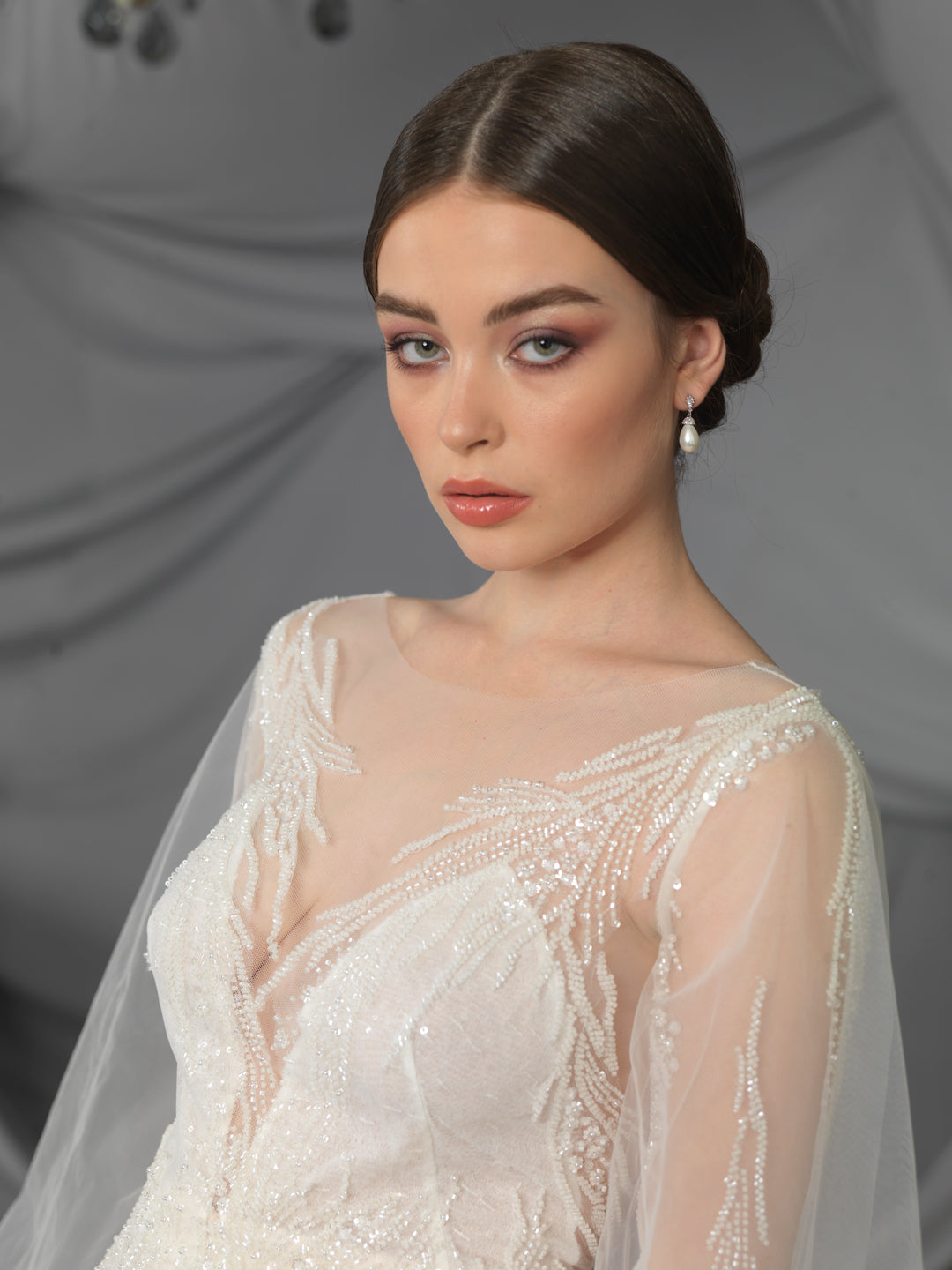 Rochie de mireasă custom made, realizată pe comandă în atelierul Natalia Vasiliev. Pentru programarea unei probe, folosește butonul „Programează o probă”.