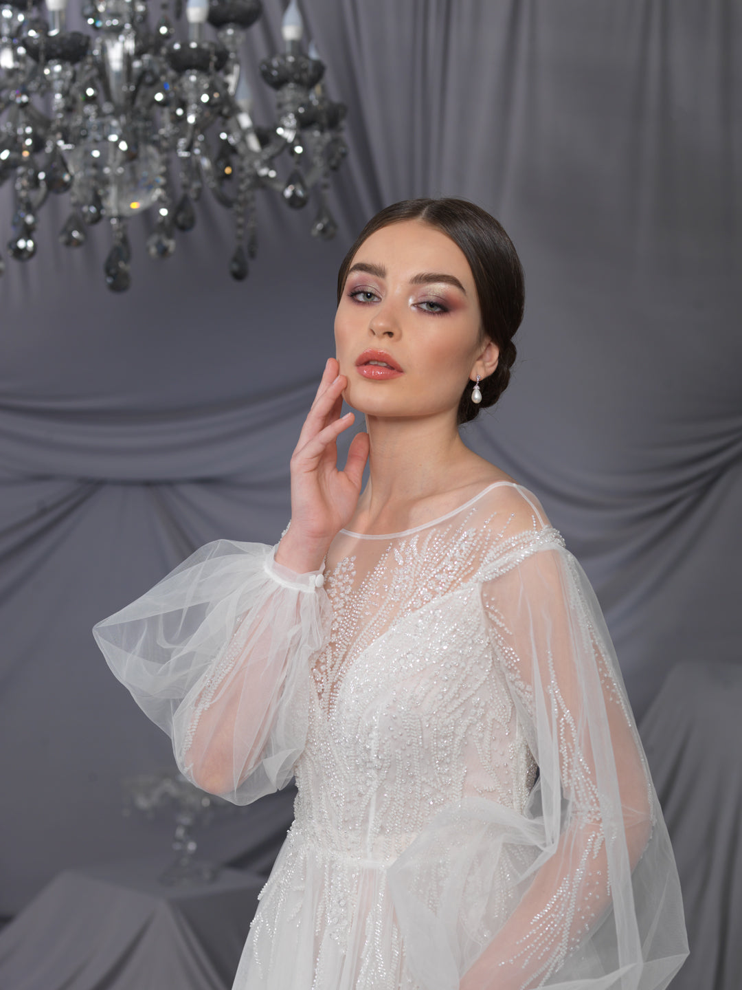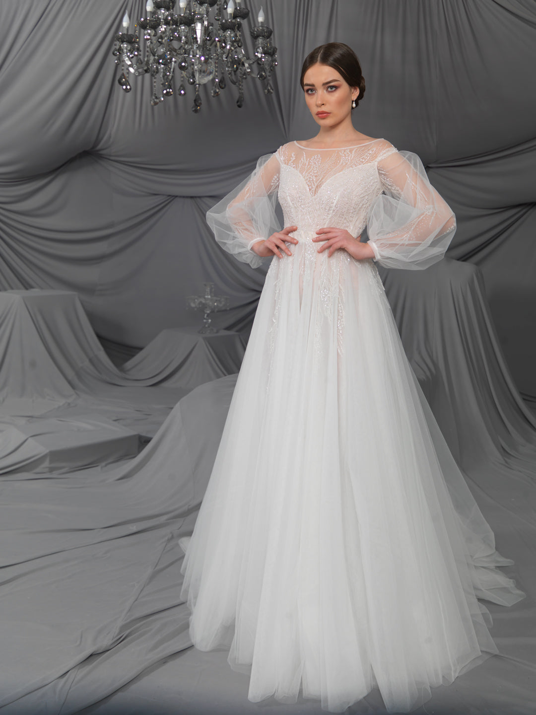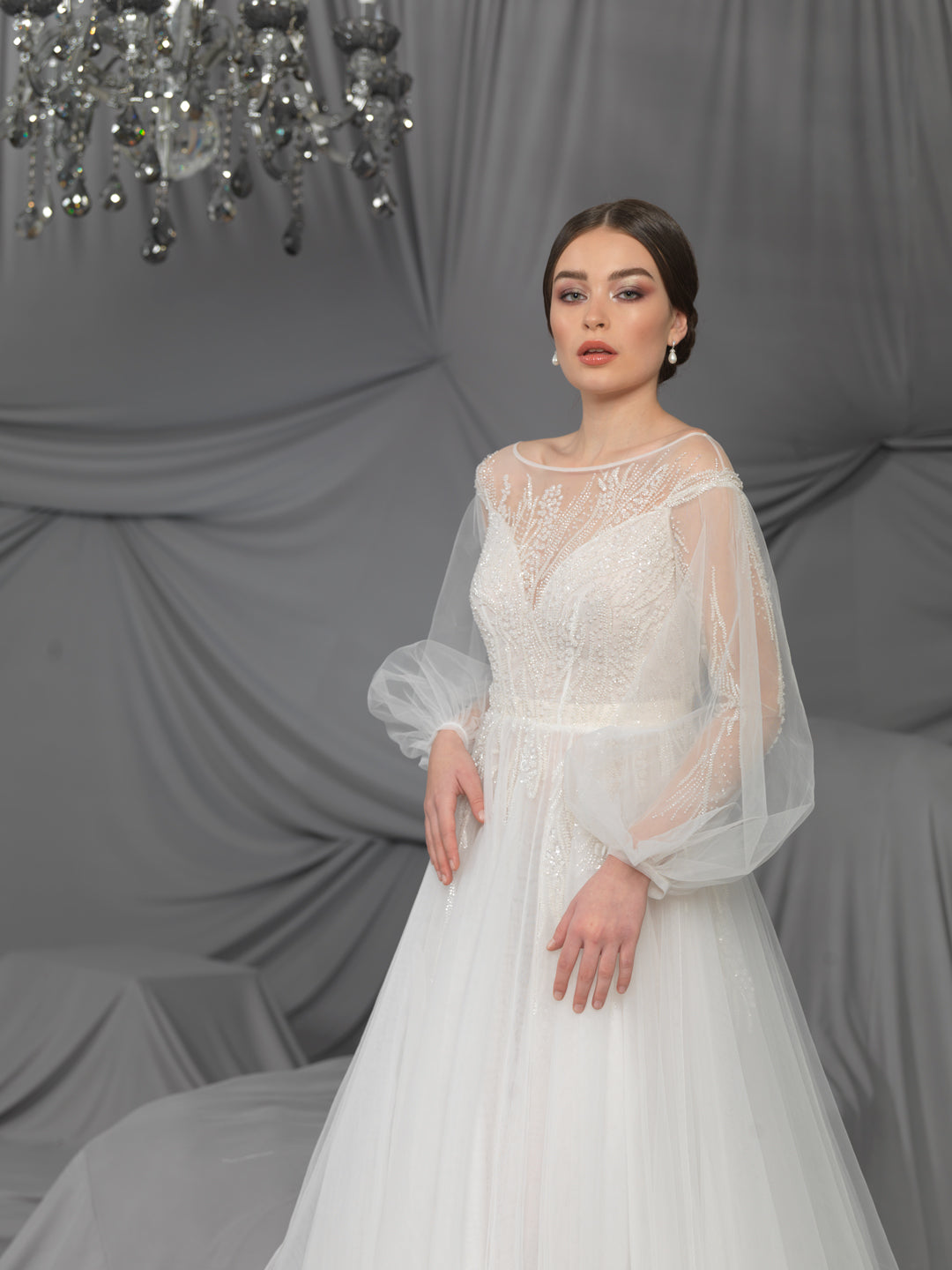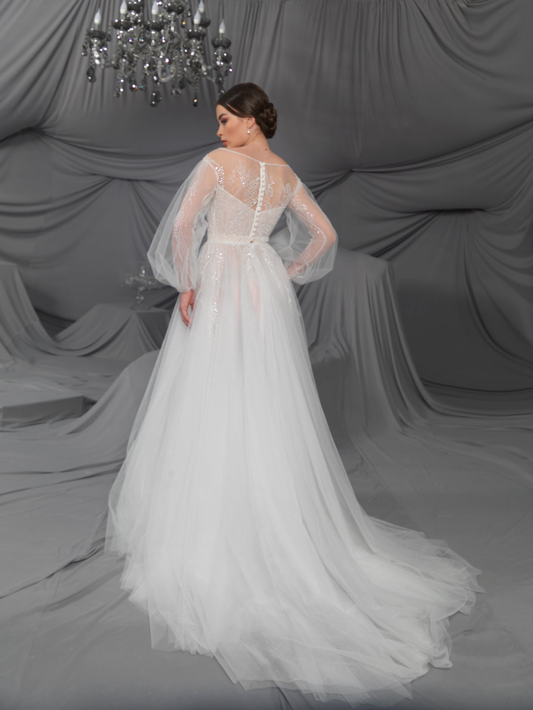 Rochie de mireasă custom made, realizată pe comandă în atelierul Natalia Vasiliev. Pentru programarea unei probe, folosește butonul „Programează o probă”.
