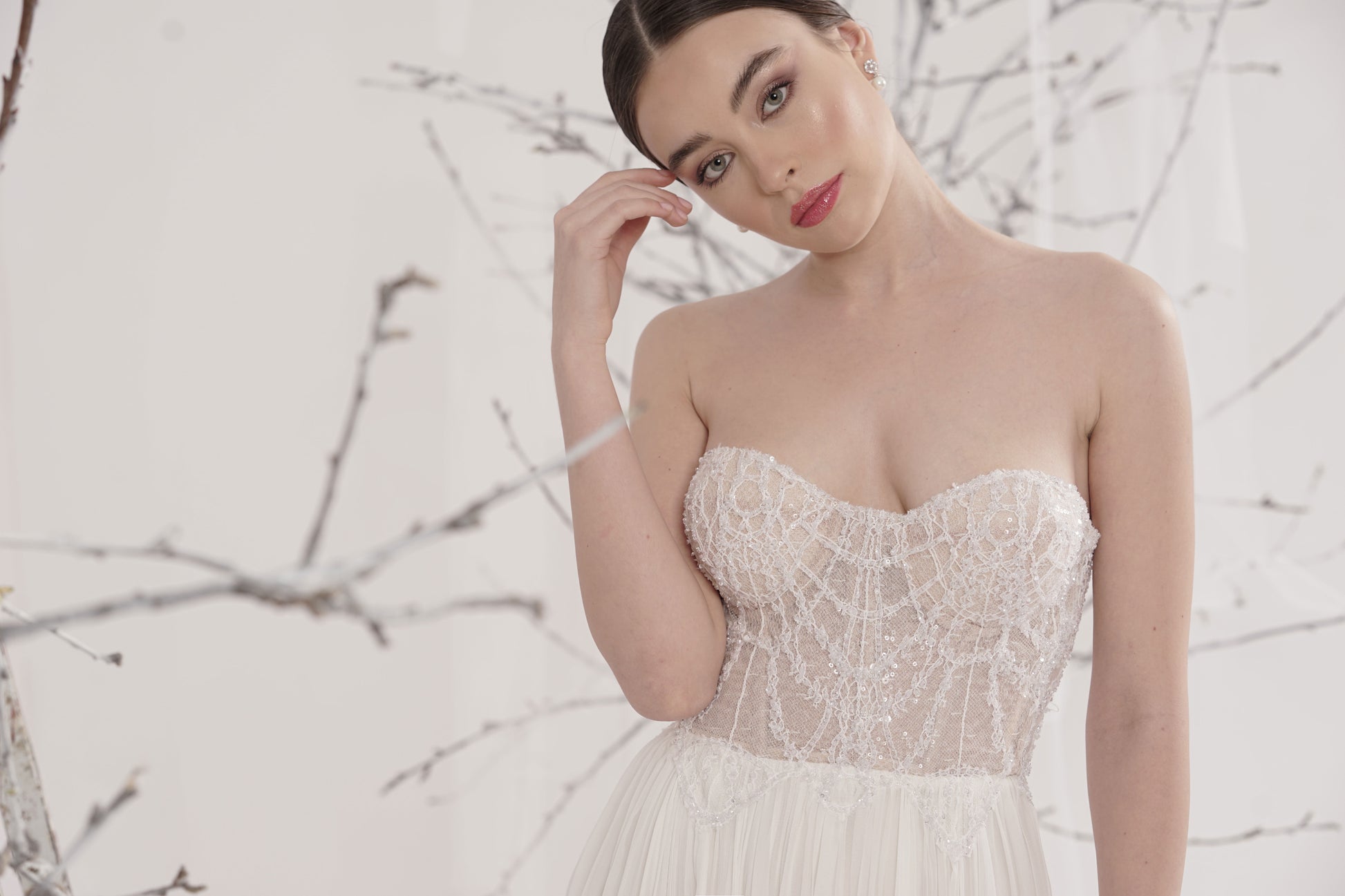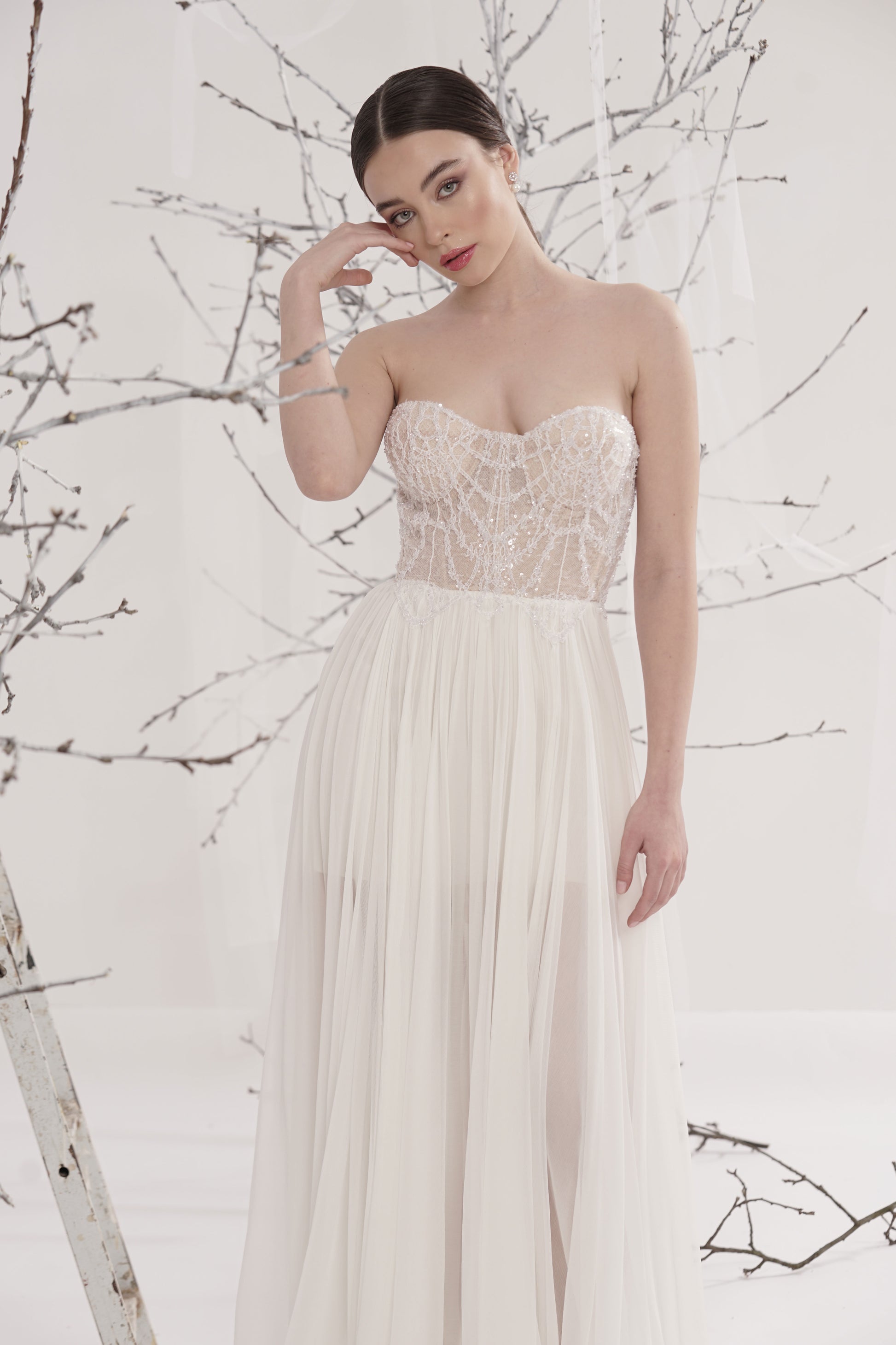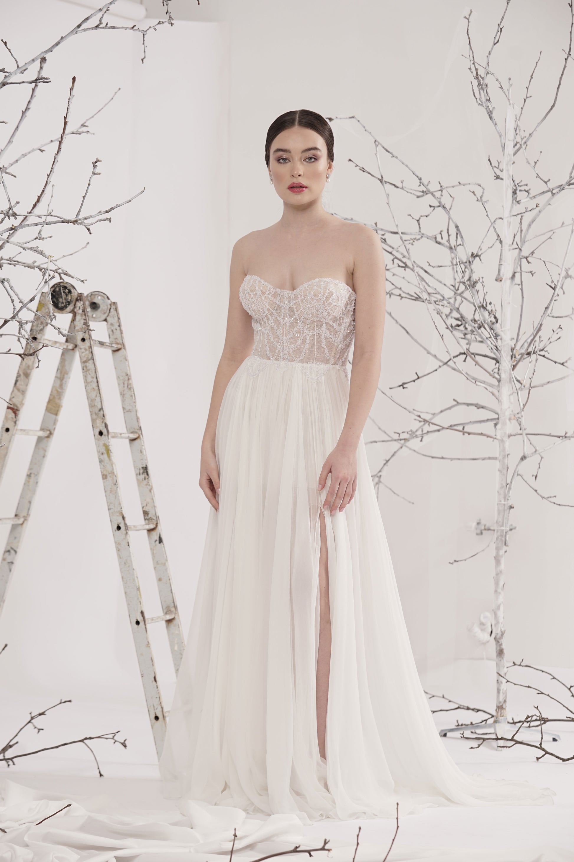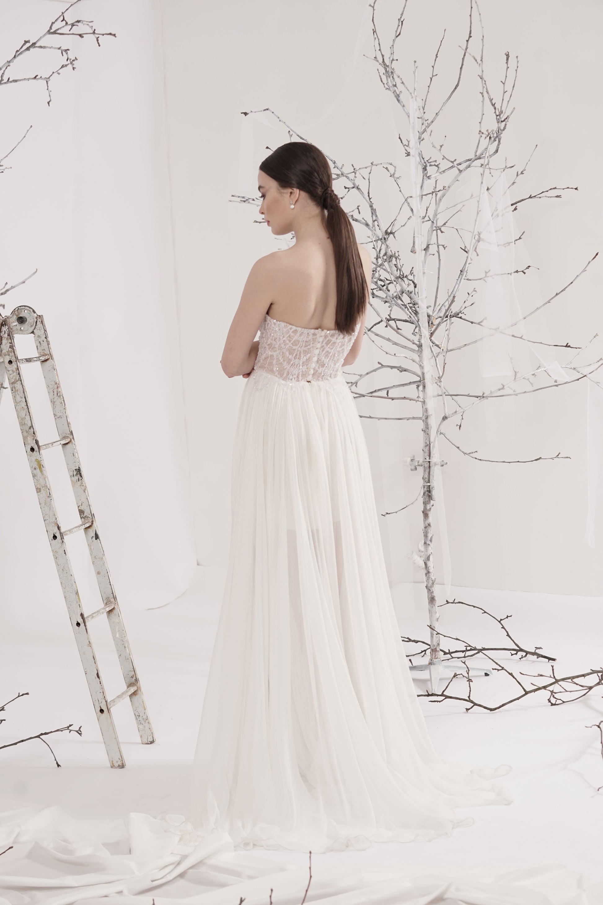 Rochie de mireasă custom made, realizată pe comandă în atelierul Natalia Vasiliev. Pentru programarea unei probe, folosește butonul „Programează o probă”.